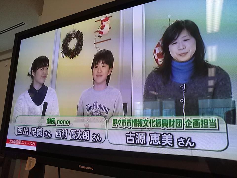 公演に向けて、がんばってますよ~ さて、公演のPRを金沢ケーブルテレビさんの番組でさせてもらうことになりました 金沢ケーブルテレビ『まちスタ530』(生放送) 日時 12月16日(月)17:30~19:00 内のコーナー「ねえねえ!聞いてたいまん」 HP http://onair-blog.jp/kct-hoso/index.html 主催の文化会館フォルテから古源さん、そして劇団から優太朗とさおりんが出演予定 生放送なので、何が起こるか分かりません!! 劇と同じく楽しいトークが繰り広げられる…はず ぜひ、ご覧ください! ================================================================ nonoらしく、楽しく和気あいあいと告知できたと思います◎ 3人ともお疲れさまでしたー! 石川テレビ『8ッピーLive いしかわキッズ!』(生放送) 日時 11月30日(土)10:30~11:15 (45分) 劇団員の優太朗が、子どもリポーターとして出演します!! 2週間にわたって行われる、いしかわ演劇祭2013。 |