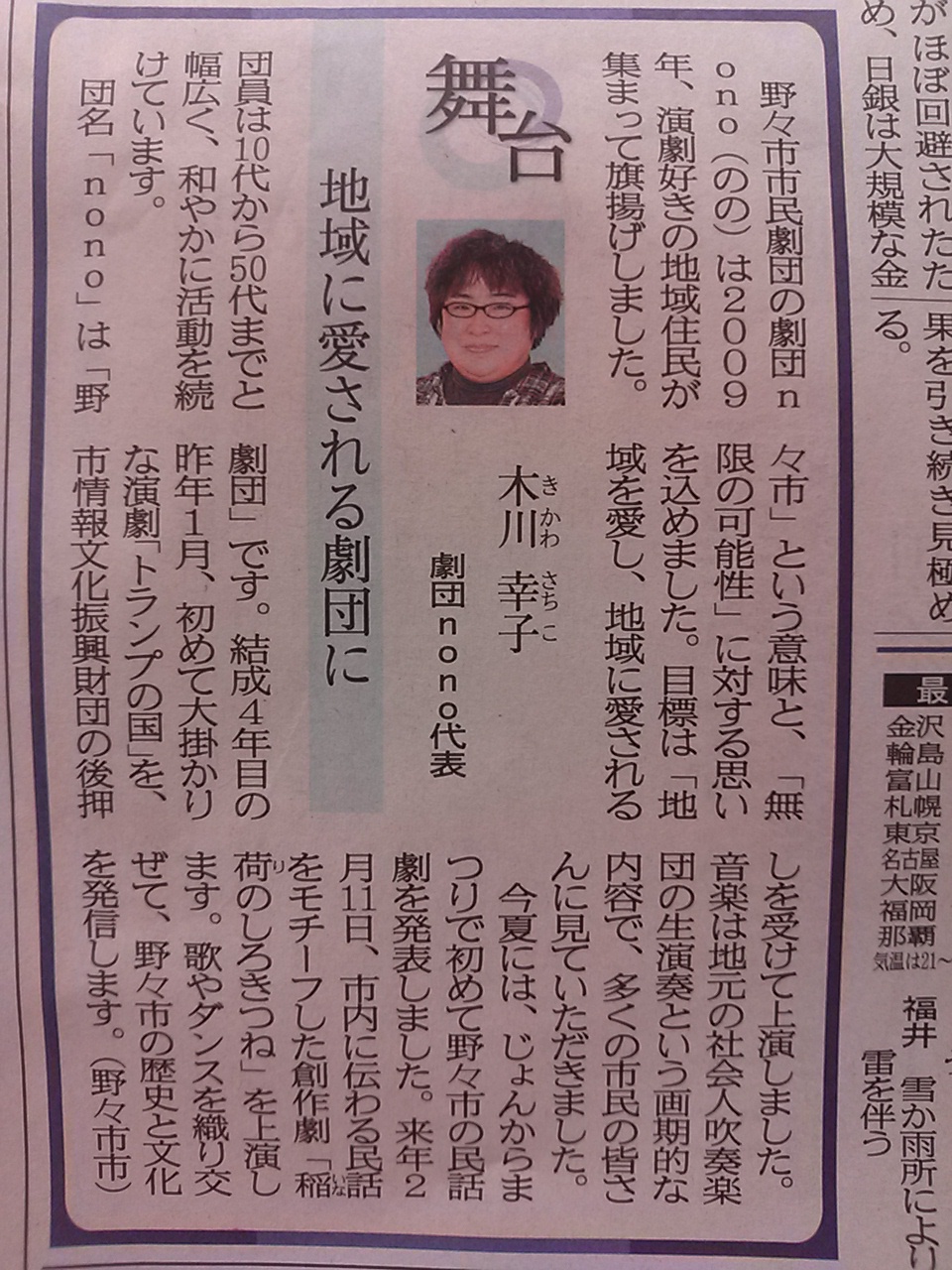12月20日(金)付の北國新聞夕刊の劇団代表のさっちゃんが載りました!