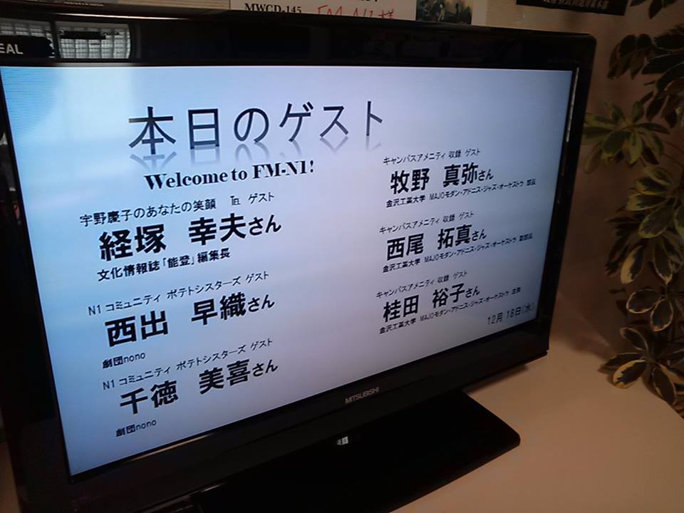 前回の様子はこちら↓ http://nono.nari-kiri.com/Entry/81/ えふえむエヌ・ワン『N1コミュニティ ポテトシスターズ』(生放送) 日時 1月15日(水)10:15~11:15 内 HP http://fmn1.jp/ 劇団から、さおりんと私(千徳)が出演予定 番組名のポテトシスターズに対抗して、nonoシスターズですよ! さおりんと、きゃぴきゃぴ(死語)告知してきます ちなみに、エヌ・ワンさんの番組はネット配信されていて、全国どこからでも聞けるって知ってました? http://www.simulradio.info/index.html#hokuriku さおりんの県外のお友達も、ぜひ聞いてくださいね~ ========================================================= 緊張したぞー!!生放送ラジオ。 ポテトシスターズのお二人は、とても話しやすくて、会話が弾んで、ちょっと時間オーバーしてしまいました…。 その後の時間調整は、さすがでした(*^-^*) 私(千徳)の「歴女」発言にミキサーの方が反応して、音楽かかってる間は末松廃寺の話で盛り上がってました(笑) さおりんは、終わった後「もっと見所、話せばよかった~」と言ってたけど、ちゃんとPRできてたよーd(^-^) えふえむエヌ・ワンのスタジオに行くと、入り口に今日のゲストの名前が書かれています。 これだけでもうれしいのに、出演前に写真を撮ってくれて、帰るときに その写真入りの番組表をいただけます!! うれしいサービスです(^^) PR