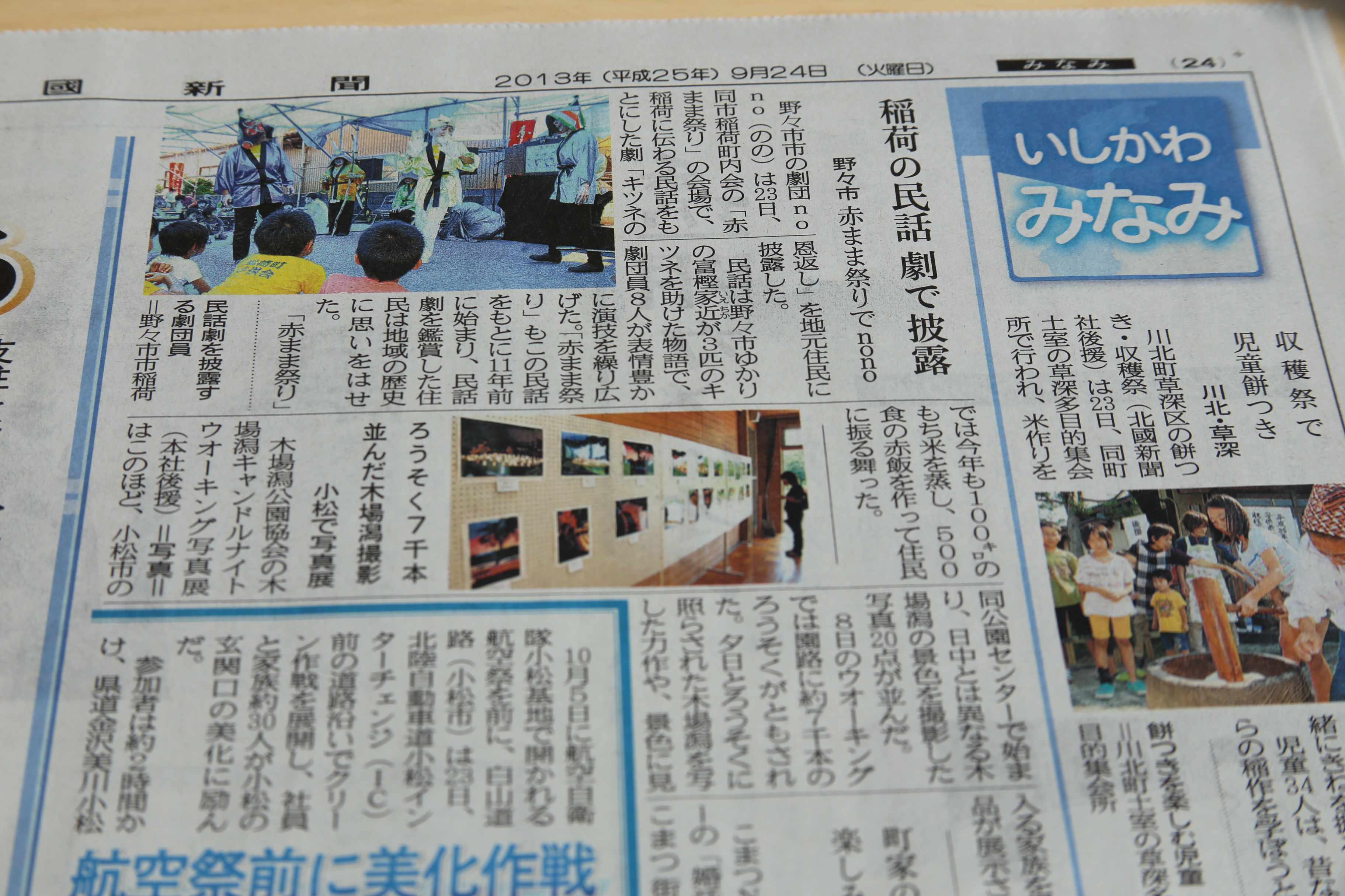× [PR]上記の広告は3ヶ月以上新規記事投稿のないブログに表示されています。新しい記事を書く事で広告が消えます。 秋分が過ぎました。 日が落ちるのが早くなってきましたね~ さて、昨日はnonoにとって大きな一歩となった日でした 午前中には、野々市市と協働で取り組む、まちづくりのアイデア「提案型協働事業の公開プレゼンテーション」に参加してきました!! 地域の課題を解決する事業を市民から提案し、採択されれば補助金などの市からの協力が得られるというものです。 nonoは「野々市の民話を活用した市内各所での民話劇」を提案しました 昔から住む人にも、新しく引っ越してきた人にも、 野々市の歴史や風習を知ってもらおうと、 野々市の民話を活用した劇を 市内のいろんな場所で披露していくという企画です。 プレゼンは、団長のさっちゃんと広報担当の千徳で行ってきました 普段、舞台に立つことはあっても、プレゼンの経験は浅い2人… ドキドキで、結果を待ちます…。 結果は、 無事、採択決定!! 市から補助金をいただけることになりました ちゃんとnonoの活動が市に認められたという証にもなりますね とりあえず、今年度あと3回、民話劇「きつねの恩返し」を市内で披露することになりました。 また、告知しますので、ぜひぜひ見に来てください そして、午後からは稲荷町さんの「赤まま祭り」で、 民話劇「きつねの恩返し」を披露。 きつねの恩返しが伝わる地元・稲荷町での公演だったので、 みなさん、興味津々 たくさんの方に見ていただくことができました 団員の力不足で、後ろの方には声が届かなかったのが残念 次回の課題です…。 でも、団員も2回目の公演ということで、アドリブを入れる余裕が出てきて やっと、楽しみながら演じることができたと思います ↑また北國新聞さんに取り上げていただきました!9月24日(火)付の朝刊です。 赤まま祭り終了後には、またもや某ファミレスでプチ 優太朗くんと南くんの2回目のバースデーを祝いました PR