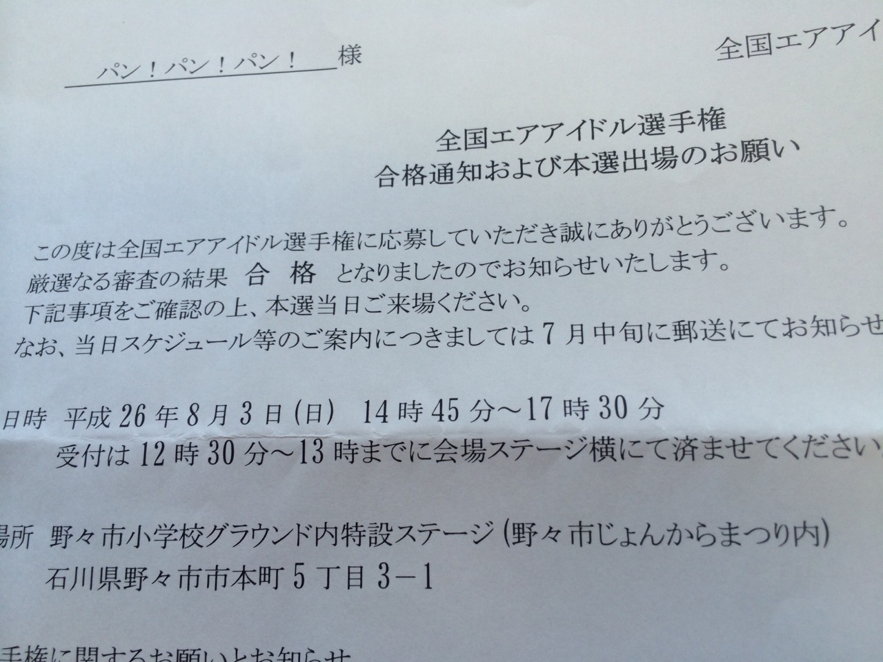 じょんからまつりに向けて、民話劇の練習してます。 あと一ヶ月とちょっと。 暑さに負けず、がんばるぞー!! そして、じょんからまつりの出演情報をもう一つ☆ 市商工会さんが主催する「第2回全国エアアイドル選手権」に、劇団員の西村優太朗、西出早織、千徳美喜が出場します! ↓「第2回全国エアアイドル選手権」↓ http://nono.shoko.or.jp/info/local/2385 90秒の映像審査があり、今日、合格通知が届きました!! チーム名は「パン!パン!パン!」で、優太朗とその友達2人がメインダンサーで、さおりんと千徳はバックダンサーを務めます♪ 出場順などは、まだ決まっていないそうですが、ぜひ当日会場での応援をお願いします(>v<) じょんからまつり「第2回エアアイドル選手権」 ■日時 8月3日(日) 14:45~17:30 ■場所 野々市小学校グラウンド内特設ステージ ■入場 無料 |