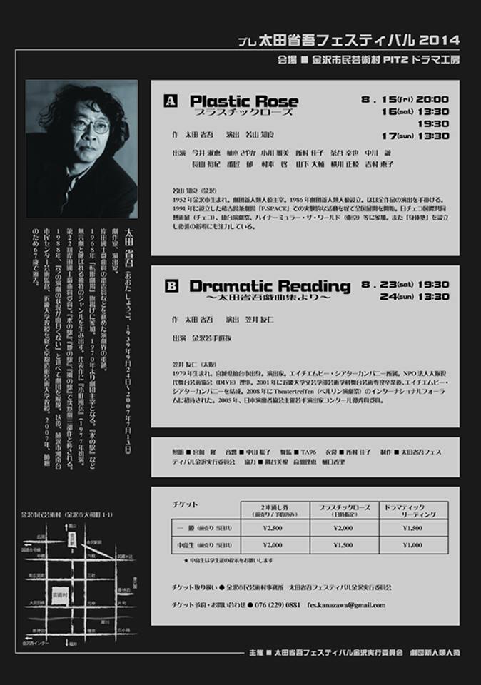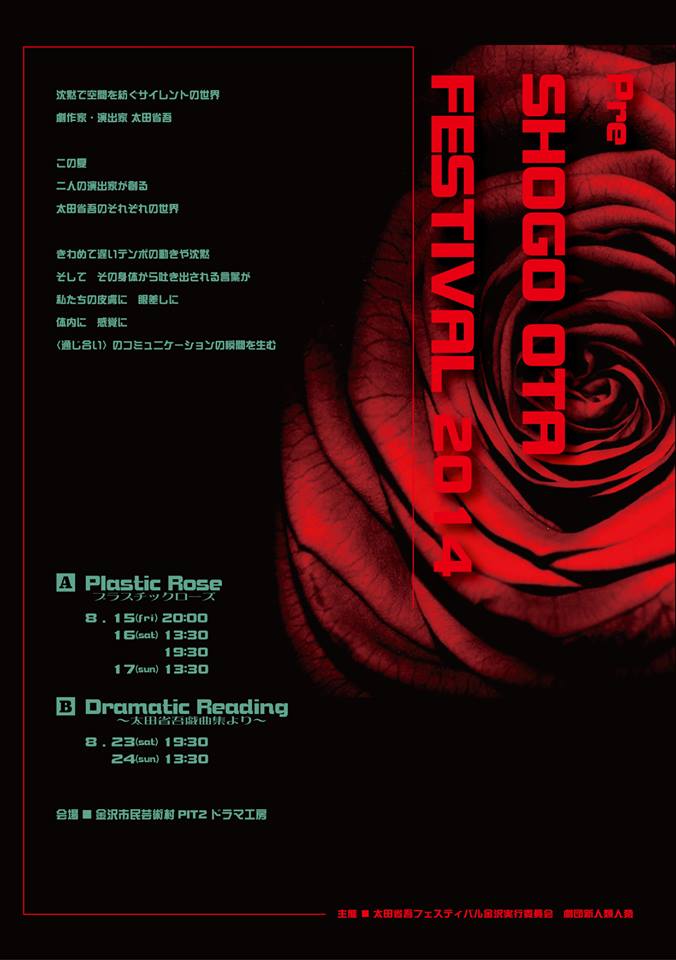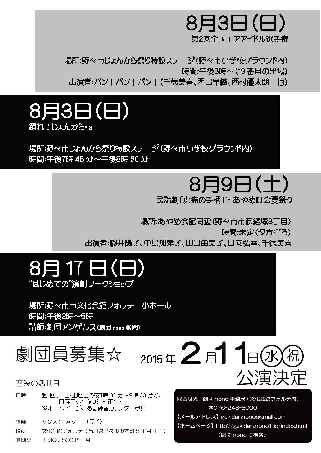恵子さんは8月15~17日、さおりんは8月23、24日で、場所は金沢市民芸術村です。 〖Pre SHOGO OTA FESTIVAL 2014〗 ■会場 金沢市民芸術村PIT2ドラマ工房 沈黙で空間を紡ぐサイレントの世界 劇作家・演出家 太田省吾... この夏 二人の演出家が創る太田省吾のそれぞれの世界 きわめて遅いテンポの動きや沈黙 その身体から吐き出される言葉が 私たちの皮膚に 眼差しに 体内に 感覚に 〈通じ合い〉というコミュニケーションの瞬間を生む A.『プラスチックローズ』 ■日時 8 . 15(fri) 20:00 16(sat) 13:30/19:30 17(sun) 13:30 作□太田 省吾 演出□若山 知良 出演□今井 淑恵 植木 さやか 小川 雅美 所村 佳子 茶谷 幸也 中川 誠 長山 裕紀 番匠 郁 村本 啓 山下 大輔 横川 正枝 吉村 恵子 B.『 Dramatic Reading〜太田省吾戯曲集より〜』 ■日時 8 . 23(sat) 19:30(終演後、劇評家西堂行人アフタートーク) 24(sun) 13:30 作□太田 省吾 演出□笠井 友仁 出演□吉岡 朱門 芳尾 勇樹 番匠 郁 西出 早織 徳田 めぐみ 中川 誠 植木 さやか 山下 大輔 ■チケット料金 『プラスチックローズ』(日時指定) 一 般(前売り 当日共)¥2,000 中高生(前売り 当日共)¥1,500 『ドラマティックリーディング』 一 般(前売り 当日共)¥1,500 中高生(前売り 当日共)¥1,000 『2本通し券』(前売り/予約のみ) 一 般 ¥2,500 中高生 ¥2,000 ★ 中高生は学生証の提示をお願いします ■チケット取り扱い 金沢市民芸術村事務所 太田省吾フェスティバル金沢実行委員会 ■チケット予約・お問い合わせ 076 (229) 0881 fes.kanazawa@gmail.com PR 劇団nonoの7~8月の出演情報のチラシを作りました! もりもり、盛りだくさんです!! ざっと挙げると、 ■7月23日(水)ののいち子ども読書の日「おはなしマラソン」 ■7月27日(日)C.C.Z.フェスティバル ■8月3日(日)民話劇「虎猫の手柄」inじょんからまつり、第2回全国エアアイドル選手権、踊れ!じょんから・la ■8月9日(土)民話劇「虎猫の手柄」inあやめ町会夏祭り ■8月17日(日)“はじめての”演劇ワークショップ あと、チラシに載ってないですが、 ■9月6日(土)民話劇「虎猫の手柄」in北國街道野々市の市 ■9月27日(土)カメリアまつり にも出演予定です☆ どれも無料のイベントなので、夏休みの思い出にぜひお越しくださ~い 今日は、じょんからまつりに向けての民話劇の練習でした! 本番1カ月前を切ったので、台本を放しての立ち稽古。 出番がない間は台本にかじりついてますが…。 衣装・小道具も少しずつそろってきました。 どんな劇になるのかな~。 まだ30%くらいしか見えてません(笑) 民話劇「虎猫の手柄」inじょんからまつり ■日時 8月3日(日) 12:00~12:30 ■場所 野々市市文化会館フォルテ ロビー ■入場 無料 ■出演者(予定) 吉村楓、駒井陽子、中島加津子、木川幸子、日向弘幸、西村優太朗 9日(水)にはLAVITさんのダンスレッスンもありました! nonoのフィナーレ曲として定着しつつある「約束」と、 劇団歌「nonoの世界へようこそ」を練習しました♪