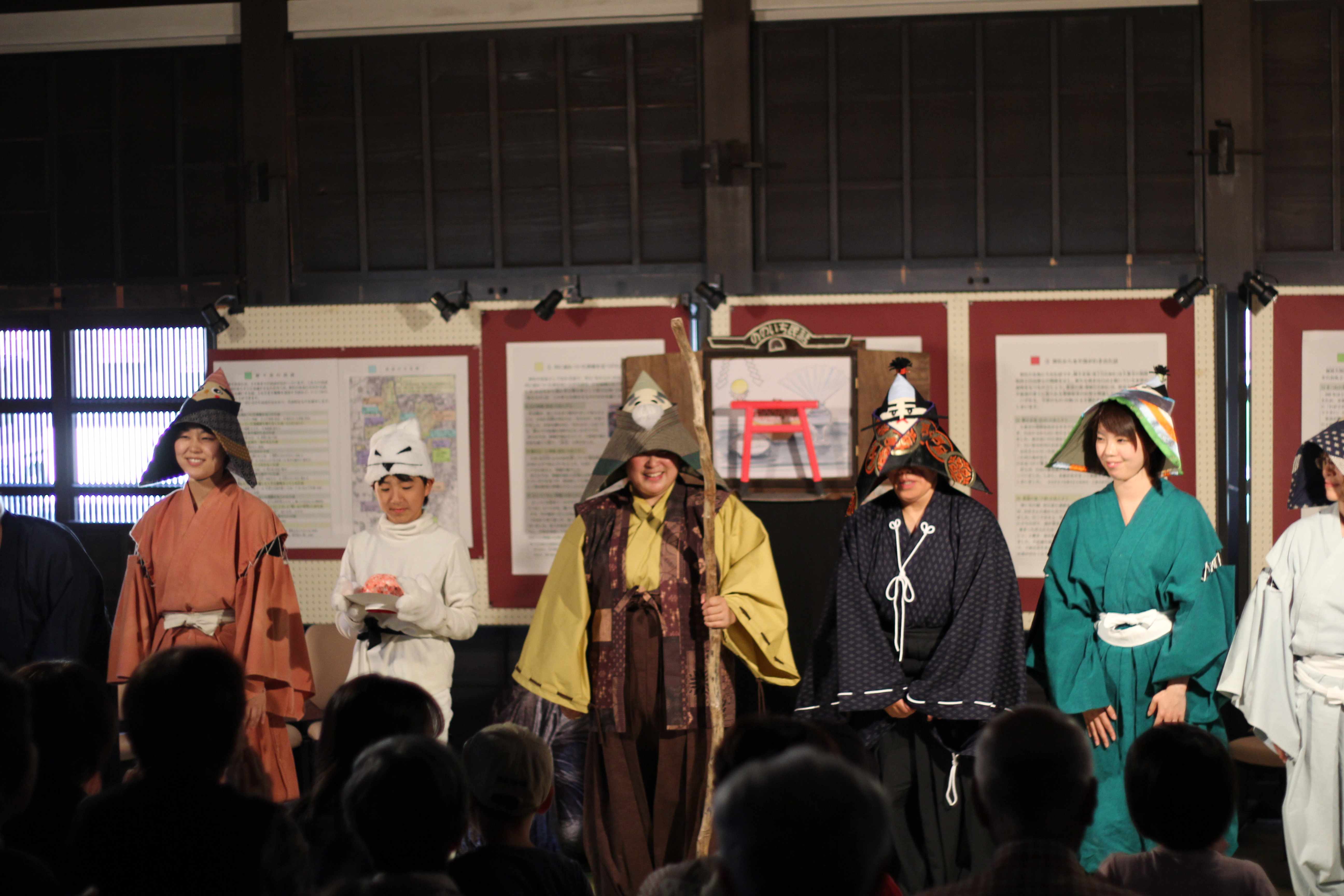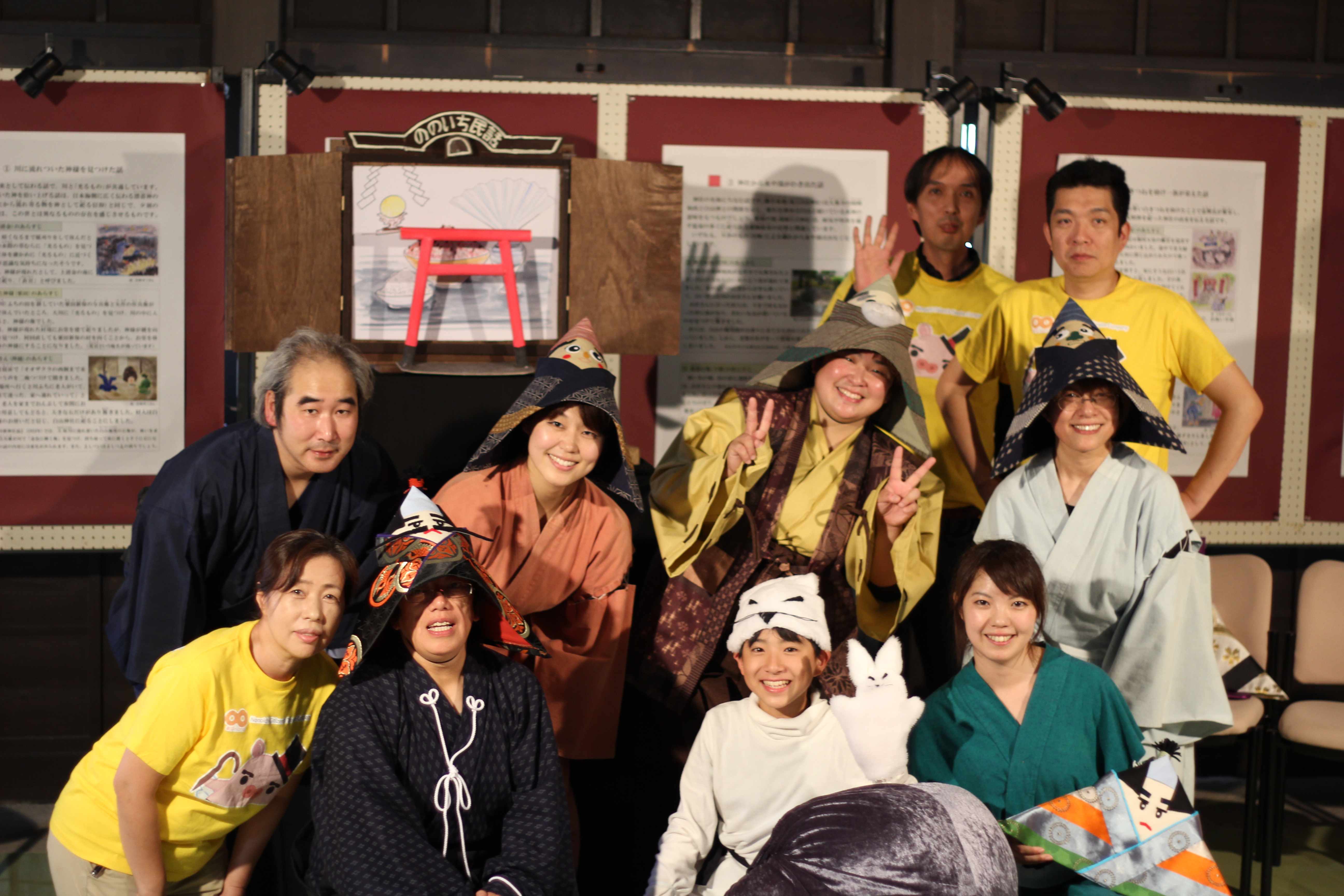 野々市市の郷土資料館で、今年3回目の民話劇「きつねの恩返し」を披露しました! 土間の部分を舞台にして、お客さんには板間からちょっと見下ろす形で見てもらいました。 土間は広いし、板間はゆったり座れるし、声は響くし、ちょうど良い感じに薄暗いし、 お芝居を見てもらうには、とっても良い環境でした!! こんな会場を使わせていただいて、ラッキーです 劇団nonoの前には、人形劇団くるりんぱの西川洋子さんによる民話の読み聞かせ。 お着物姿がとってもお似合いで、雰囲気作りがお上手でした~ そして、劇団nonoの番。 お芝居が始まっても、 古民家から漏れ聞こえる音楽やセリフが物珍しいからか(?)、 どんどんお客さんが入ってこられて、満員御礼+++でした! ご来場いただいた皆さん、本当にありがとうございました!! 野々市の最大のお祭り・じょんからまつりで披露した劇だったので、 「なんだー、一緒の話か~」と言われるかと思ったら、 「初めて見たよ~」という方がほとんどで、 劇団nonoも民話劇もまだまだ認知されていないのだなぁ… と、嬉しくもあり、悲しくもあり複雑な気持ちでした 新団員の早織ちゃんとひろあきさんは堂々デビュー 今回もたくさんの方に楽しんでいただけたようで、よかったです そして、市の提案型協働事業に採択されたことで、 衣装と音響機材を新たに購入することができ、 劇全体の質が向上したと思います 次は、11月4日(月・祝)に「マナビィフェスタ」で民話劇やります!! 場所は野々市市中央公民館で、時間は午後1時~1時30分です 当日は、nonoがお店も出すよー 皆さん、今日は石川テレビ見てくれましたか!? 石川テレビ『8ッピーLive いしかわキッズ!』(生放送) 日時 10月5日(土)10:30~11:15 (45分) 劇団員の優太朗が、子どもリポーターとして出演します!!