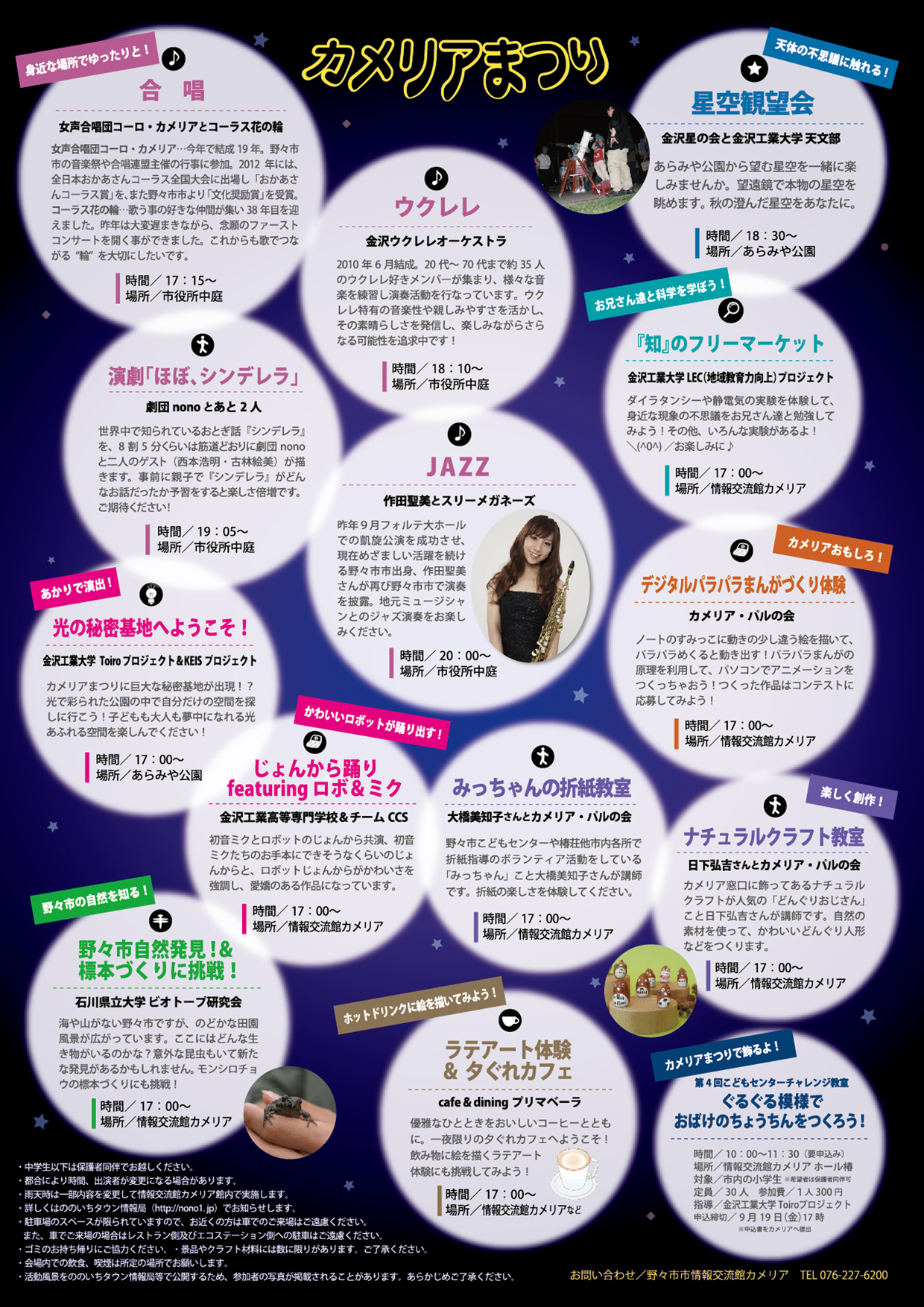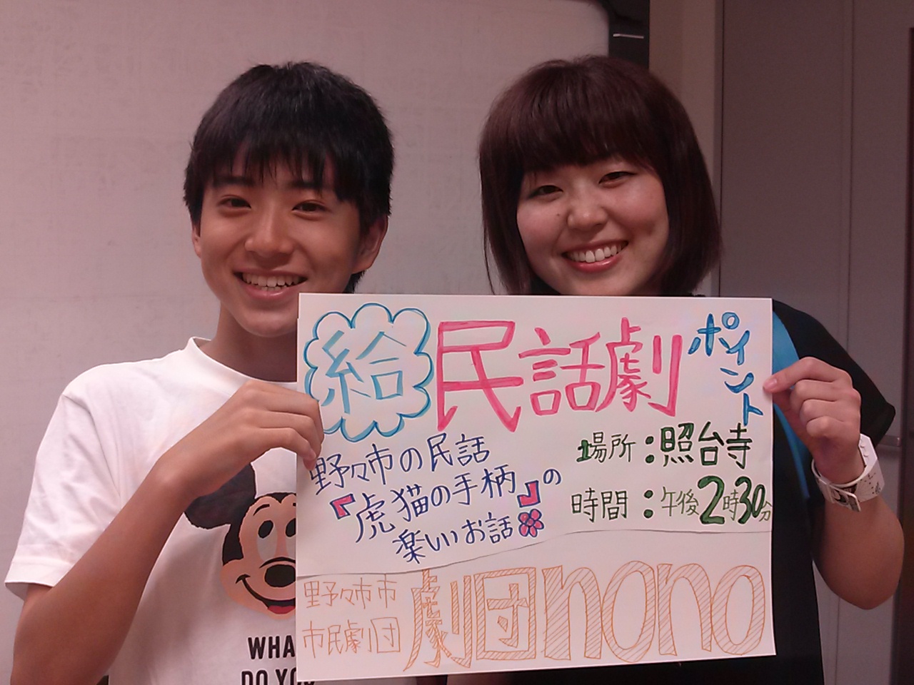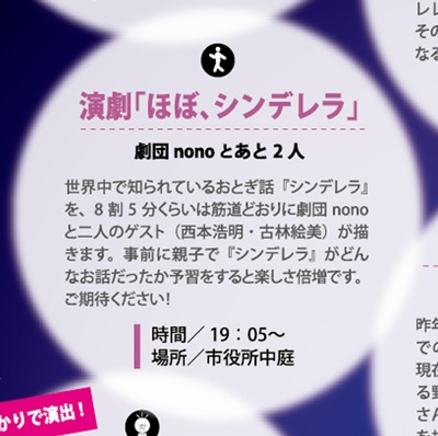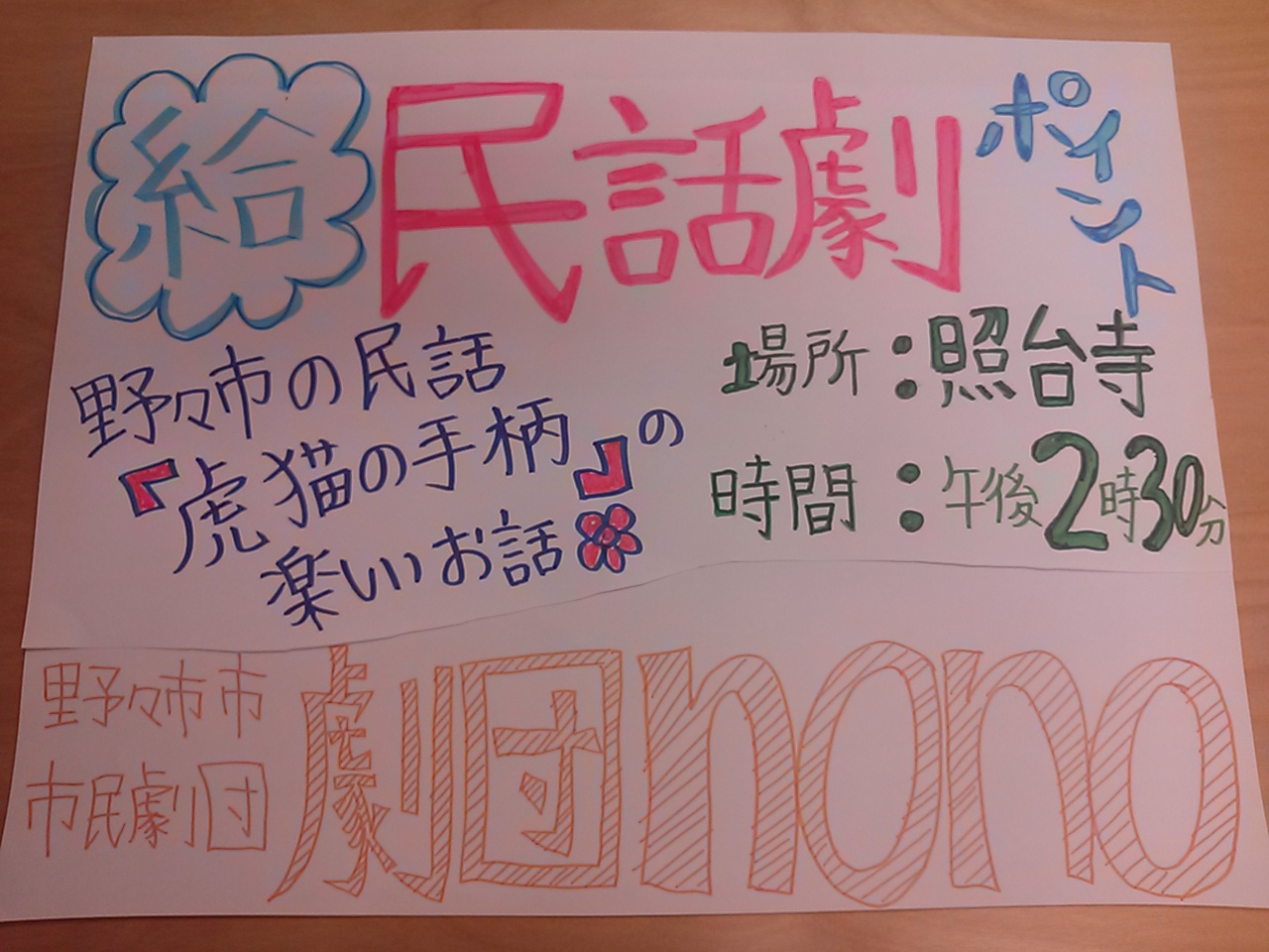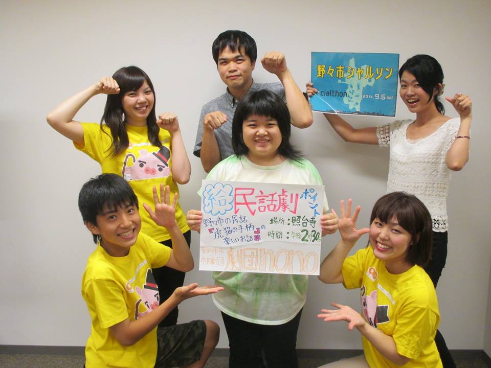 うちの中・高校生団員も宿題の追い込み頑張ってます!!(きっと) さて、9月には2本のイベント出演を予定しています まずは、9月6日(土)。 ■民話劇「虎猫の手柄」in北国街道野々市の市 ■場所 照台寺(野々市市本町3丁目) ■時間 午後2時30分から ■出演者(予定) 吉村楓、駒井陽子、中島加津子、山口由美子、日向弘幸、千徳美喜 じょんからまつりでも披露したトラとネズミの民話劇を、お話の舞台である照台寺さんで上演します! ↑同日開催される「野々市シャルソン」の給○ポイントにも登録しています 野々市シャルソンに参加している方は、午後2時30分からの劇を見終わった後、出演者と写真撮影ができます!! 県内初のシャルソン、一緒に楽しみましょー♪ ↓野々市市情報交流館カメリア「野々市シャルソン」↓ http://camellia.nono1.jp/2014/07/cialthon/ そして、9月27日(土)。 ■カメリアまつり 演劇「ほぼ、シンデレラ」 ■場所 野々市市情報交流館カメリア 中庭 ■時間 午後7時5分から ■出演者(予定) 千徳美喜、木川幸子、吉村楓、駒井陽子、日向弘幸、吉村恵子、西出早織、西村優太朗、山口由美子、中島加津子 【ゲスト】西本浩明、古林絵美(劇団ひまわり) 金沢ナイトミュージアム2014で「朗読・パフォーマンス部門」のディレクターを務める西本浩明さん(野々市市在住)と劇団nonoがタッグを組んで、新説シンデレラを披露します 台本は、団員の個性に合わせて西本さんが書き下ろしてくれました!! 主役のシンデレラに古林絵美さん(劇団ひまわり)を迎えて、秋の夜長にお届けする「ほぼ、シンデレラ」。 稽古はすでに始まっています! 乞うご期待!! ↓野々市市情報交流館カメリア「カメリアまつり」↓ http://camellia.nono1.jp/2014/08/camelliafes-6/ |